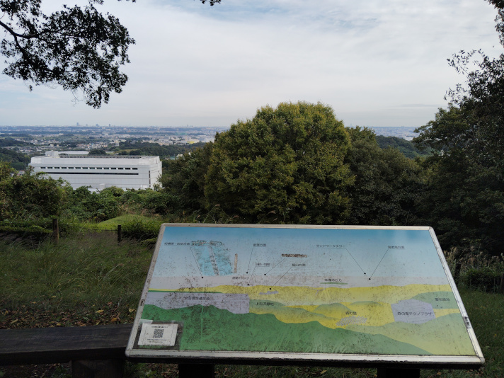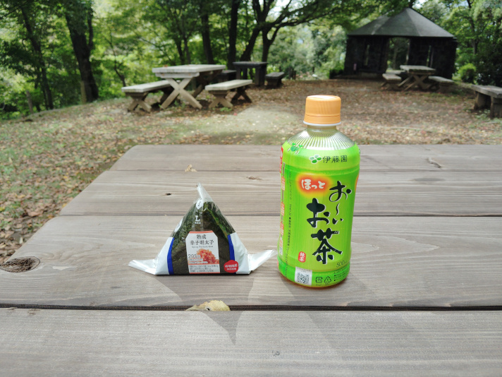 少し戻って、さっきの分かれ道を右に行くと “ながめの丘” がありました。風が吹いていて少し寒かったですが、ここで昼食にしました。おにぎりは2個あったんだけど、撮る前に一つ食べちゃいました😁 右下の写真の奥の方、遠くに “横浜ランドマークタワー” が見えています。