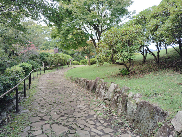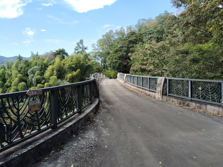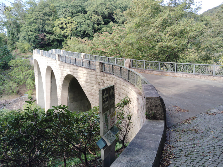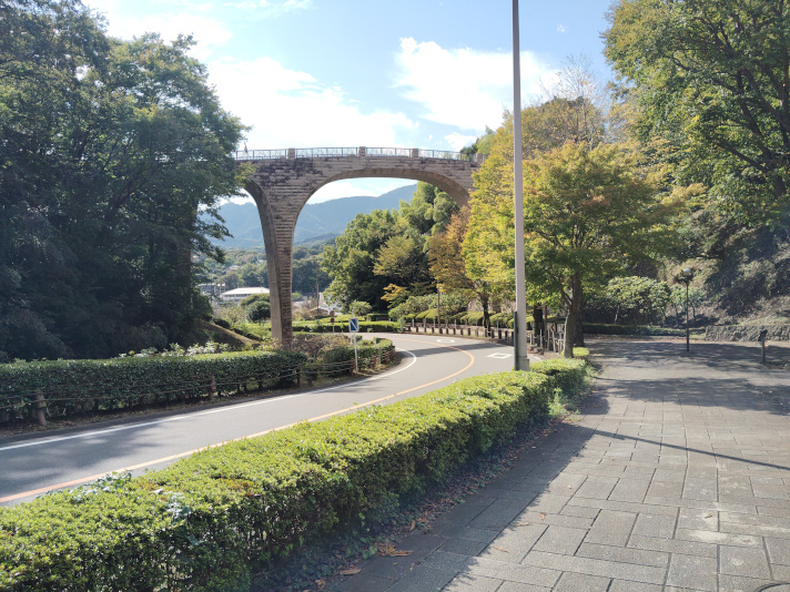 こういうところでのバーベキューも楽しいかもしれないと思いつつ、さらに石畳の道を下っていきます。そして入り口付近に戻ってきました。入り口の手前にアーチ橋があったんですが、その橋はこの石畳の道から通れるようになっていました。